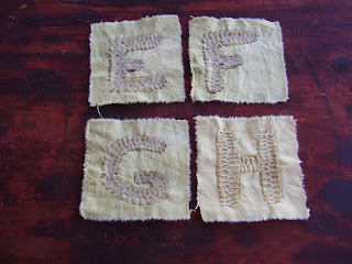 Here are my next four letters. These little linen sachets are very fiddly to make and very hard to get square! I do like stitching on the linen though and it irons beautifully.