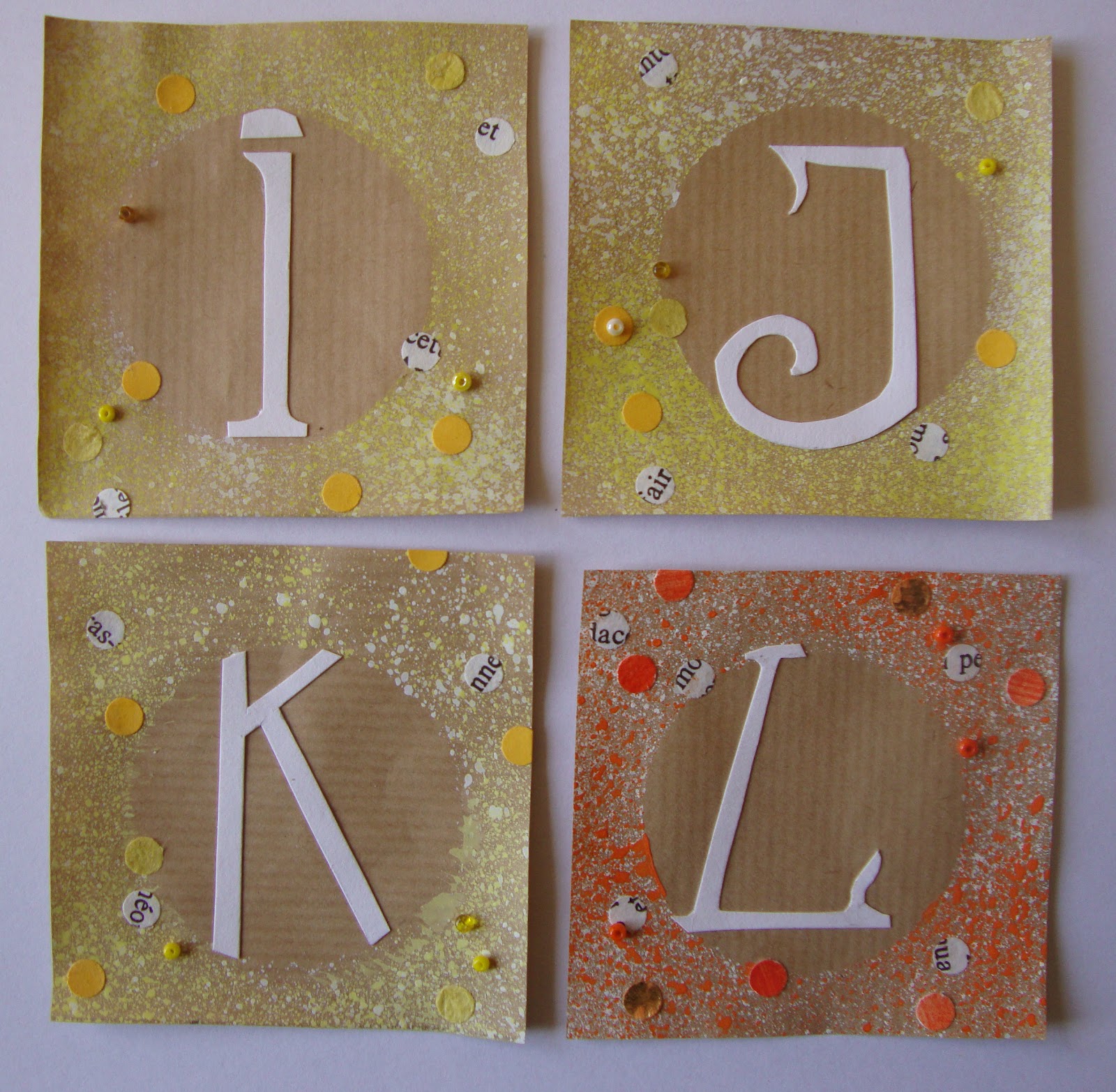 I send you my first letters for 2012, painted on “papier kraft” (I don’t know the name in English) each one in a circle and surrounded by paper “confetti” and little pearls.